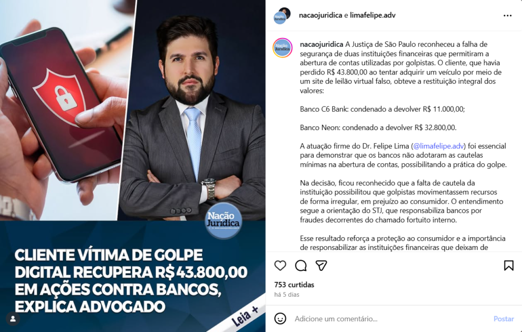 Com ampla experiência na área e, após anos de estudo e prática jurídica, o escritório Felipe Lima Advocacia desenvolveu o seu próprio método de atuação para responsabilizar os bancos na Justiça, sendo, inclusive, reconhecido pela a maior página jurídica do país, o que reforça nosso compromisso com a ética, a excelência técnica e a busca por resultados consistentes.
